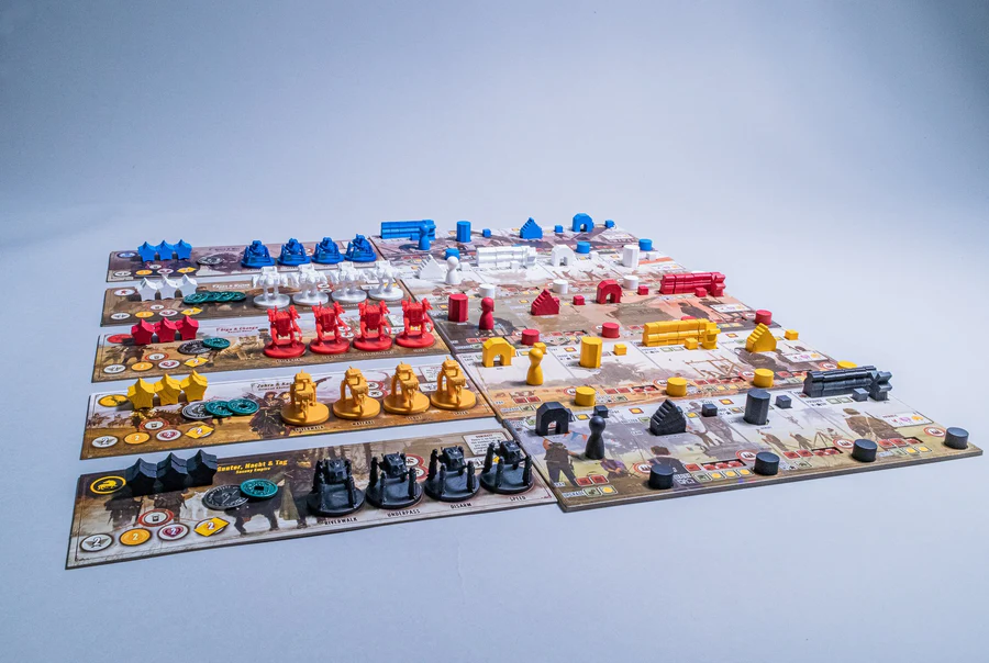 In Scythe, you’ll be managing four types of resources: food, wood, metal, and oil. These resources are essential for building structures, deploying mechs, recruiting characters, and upgrading actions. However, resource management in Scythe comes with a unique twist – resources remain on the board, making them susceptible to theft by other players.